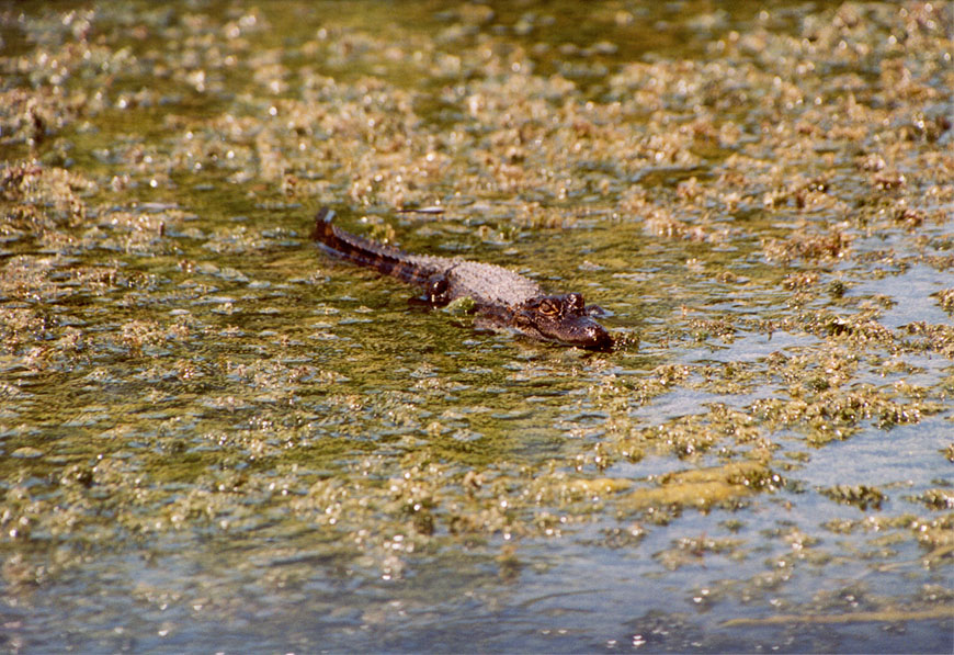 Alligator mississippiensis - This juvenile alligator, still showing its stripes, is resting on a dense patch of hydrilla (Hydrilla verticillata) accidentally introduced into the spring in 1997.