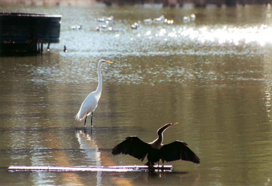 Ardea alba - Great Egret (Ardea alba) with female Anhinga (Anhinga anhinga)