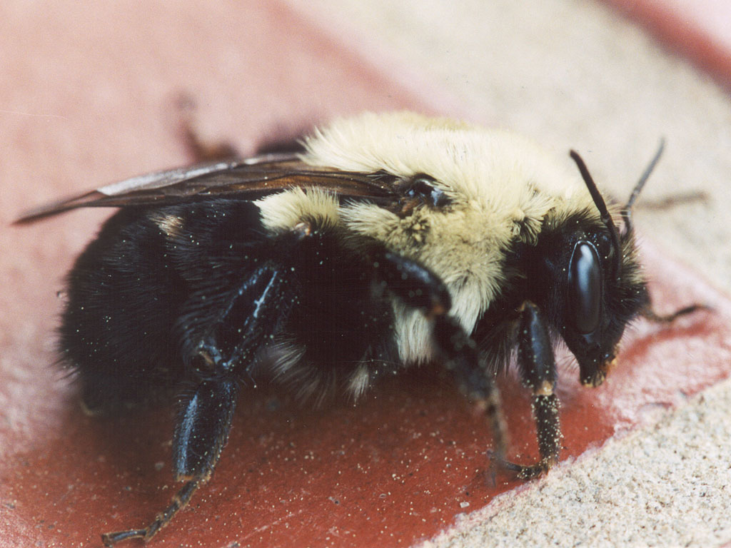 Bombus impatiens - This is the same queen bumble bee as in the above photo. Yellow, wind-blown oak pollen can be seen on the tips of some of the bumble bee's setae (hairs) and scattered along the tile walkway. Flower pollen is normally collected in the corbicula, a pollen-trapping, hair-surrounded, bare section of the hind tibiae of most queen and worker bumble bees. This queen's empty corbicula can be seen here (left-center).