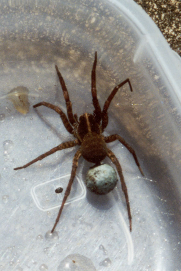 Hogna georgicola - (female) in container. She carries her blue egg case, attached to her lower abdomen by a few strands of strong silk.