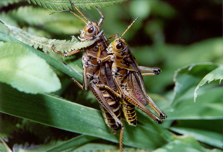 Romalea guttata - mating -- The smaller males range in size from about 43-55mm while the females range from about 50-70mm.